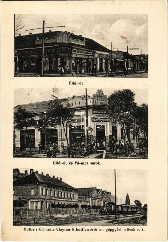 Budapest XIX. Kispest, Hofherr-Schrantz-Clayton-Shuttleworth m. gépgyári művek rt., gőzmozdony, vonat, Üllői út és Fő utca sarok, Füredi Miksa üzlete, Fischhof Henrik Könyvnyomda (Rb)