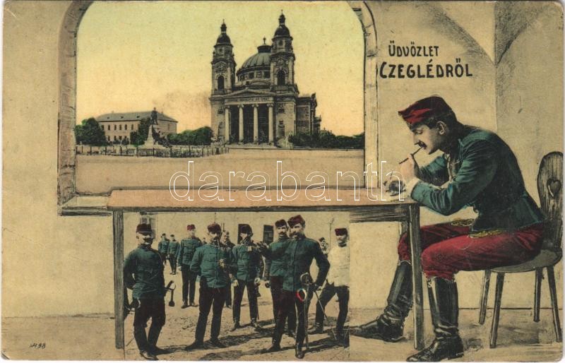 Cegléd, Református templom. Üdvözlet, montázs a laktanya udvaráról lev... https://www.darabanth.com/de/36-Gross-Auktion/36.1/Ansichtskarten/Ungarn~15417/Cegled-Reformatus-templom-Udvozlet-montazs-a-laktanya-udvararol-levelet-iro-katonaval-~II2479406