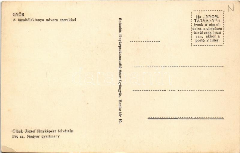 Győr, Tűzoltólaktanya udvara szekerekkel, tűzoltókocsik. Glück József ... https://www.darabanth.com/de/36-Gross-Auktion/36.1/Ansichtskarten/Ungarn~15417/Gyor-Tuzoltolaktanya-udvara-szekerekkel-tuzoltokocsik-Gluck-Jozsef-fenykepesz-felvetel~II2483265