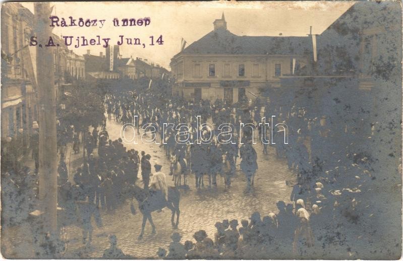 Sátoraljaújhely, Rákóczi ünnepség (Nyári mulatság felirat a zászlón) június 14-én, lovas felvonulás. Háttérben Róth Sándor üzlete. photo (ragasztónyom / gluemark)