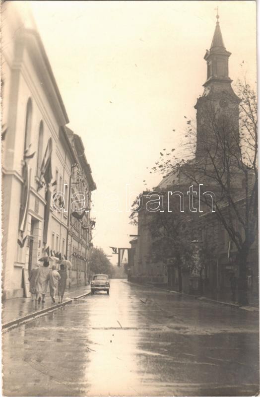Beschreibung: Székesfehérvár, Kossuth utca esőben, Kármelita templom. photo (non PC) (EB)
