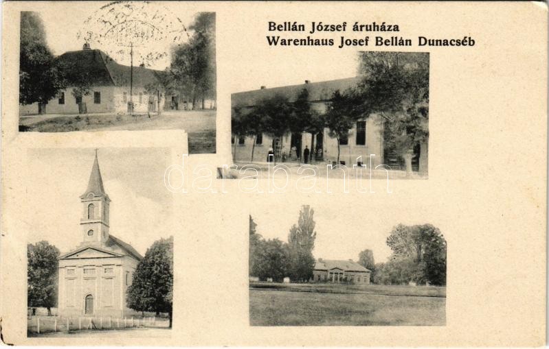 Beschreibung: 1909 Dunacséb, Dunaczéb, Celarevo; Dungyerszky kastély, templom, Bellán József üzlete / castle, church, shop (Rb)