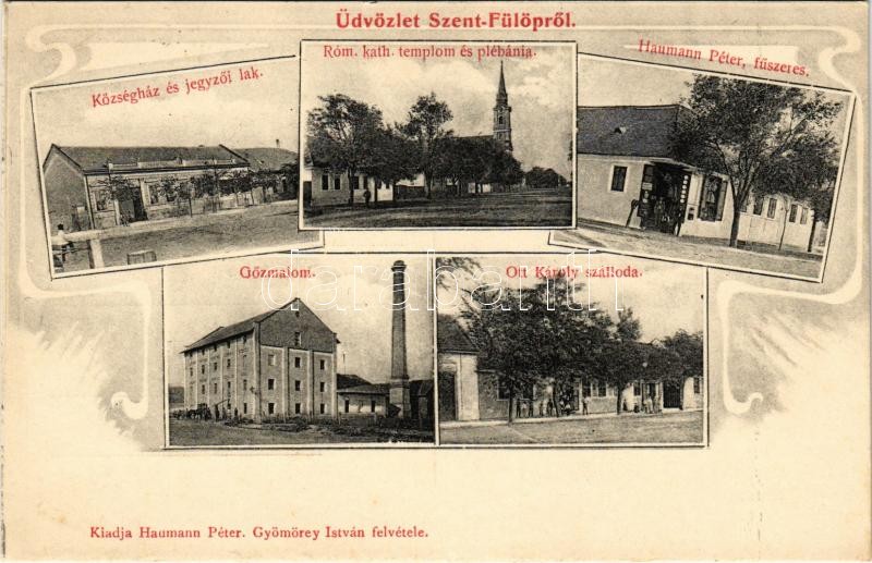 1909 Szentfülöp, Filipsdorf, Filipowa, Backi Gracac; Községház, jegyzői lak, gőzmalom, Római katolikus templom és plébánia, Ott Károly szálloda, Haumann Péter fűszeres üzlete és saját kiadása, Gyömörey István felvétele / town hall, notary, mill, church and parish, hotel, shop. Art Nouveau