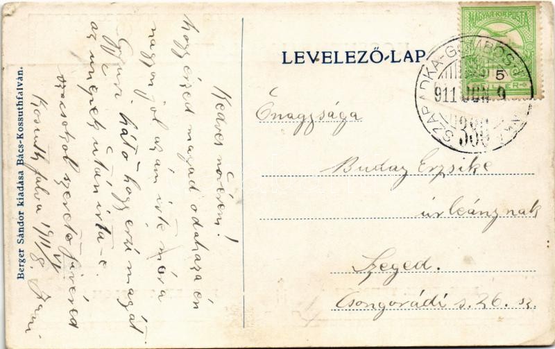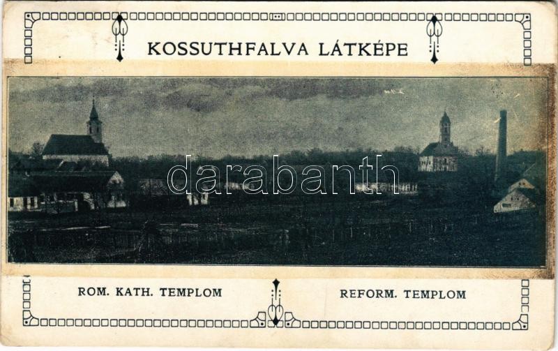1911 Bácskossuthfalva, Kossuthfalva, Moravica, Ómoravica, Stara Moravica; Római katolikus és református templomok / churches. Art Nouveau + "SZABADKA-GOMBOS-PALANKA 386." vasúti mozgóposta (EK)
