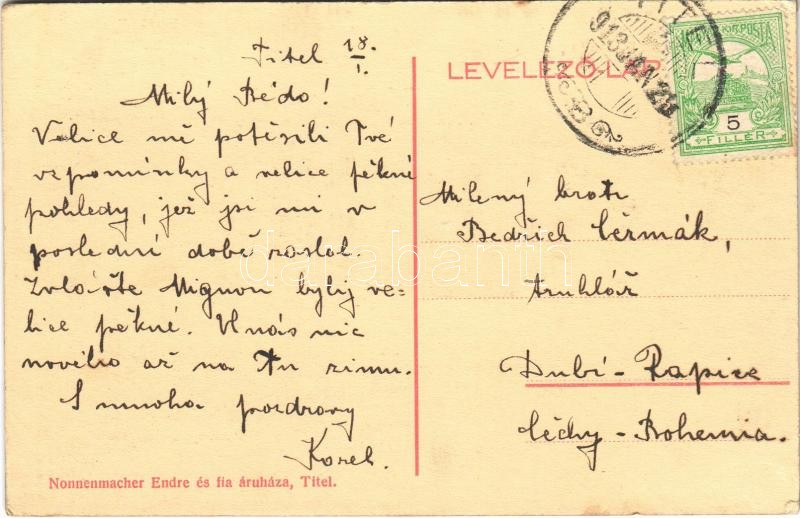 1913 Titel, Tisza részlet, gőzhajó. Nonnenmacher Endre és fia kiadása ... https://www.darabanth.com/de/36-Gross-Auktion/36.1/Ansichtskarten/Vojvodina~15426/1913-Titel-Tisza-reszlet-gozhajo-Nonnenmacher-Endre-es-fia-kiadasa-riverside-steamship-r~II2447042