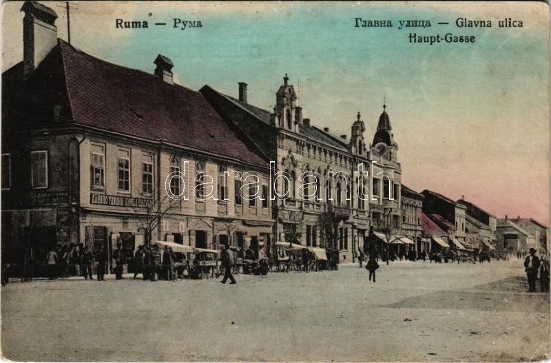 Beschreibung: 1914 Árpatarló, Ruma; Fő utca, piac, Danilo Udicki üzlete / Glavna ulica / main street, market, shop (Rb)