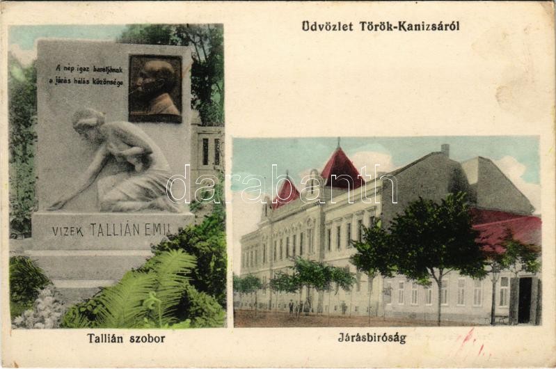 Beschreibung: 1915 Törökkanizsa, Nova Kanjiza, Novi Knezevac; Vitéz Tallián Emil szobor, Járásbíróság. Özv. Schweiger Hermanné utóda kiadása / county court, statue (EK)