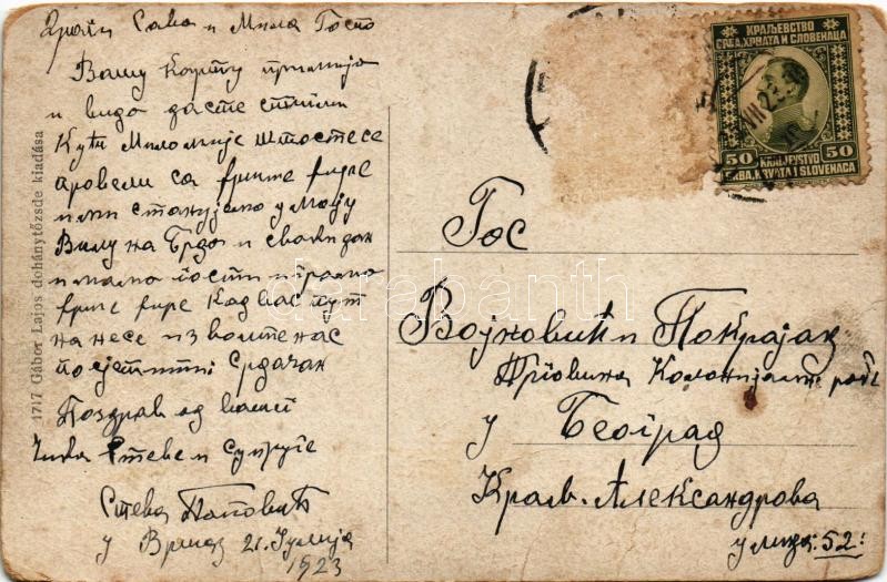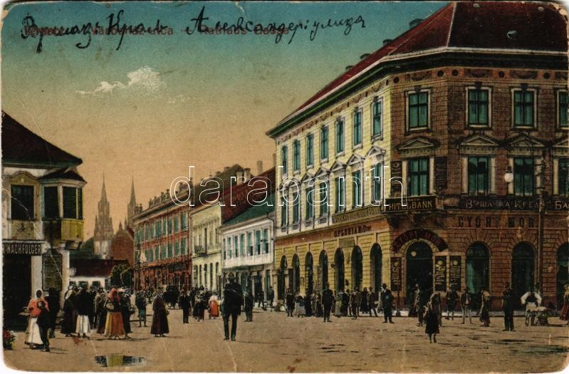 1923 Versec, Vrsac; Városház utca, Verseczi Hitelbank, Győri Mór, G. Florian & Comp. üzlete, Glückmann Hungária szálló. Gábor Lajos kiadása / street, bank, shops, hotel (EB)