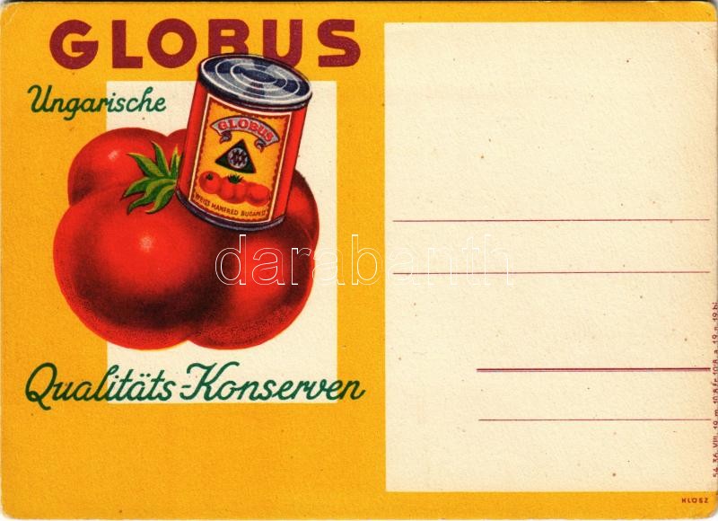Globus konzervek német nyelvű reklámlapja. Klösz / Ungarische Qualität... https://www.darabanth.com/de/36-Gross-Auktion/36.1/Ansichtskarten/Werbungen~15503/Globus-konzervek-nemet-nyelvu-reklamlapja-Klosz-Ungarische-Qualitats-Konserven-Hungarian-c~II2486113