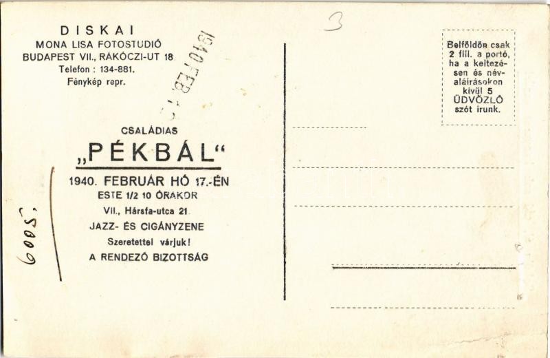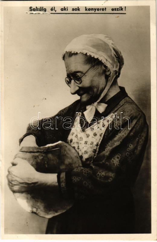 Sokáig él, aki sok kenyeret eszik! Hátoldalon "Családias Pékbál" meghívó. Diskai Mona Lisa Fotostudió / Hungarian baker's ball advertisement and invitation (apró lyukak / tiny pinholes)
