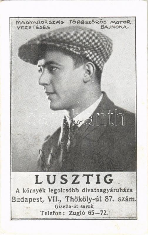 Szekeres Béla, kerékpáros, Magyarország többszoros motorvezetéses bajnoka. Lusztig divatnagyáruháza reklámlapja. Budapest XIV. Thököly út 87. / Hungarian cyclist champion, fashion store advertisement (non PC) (EK)