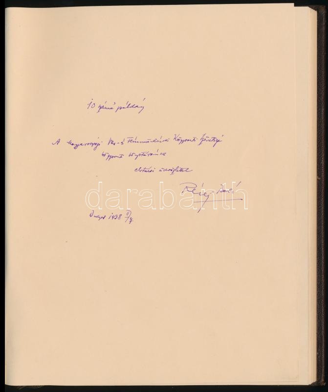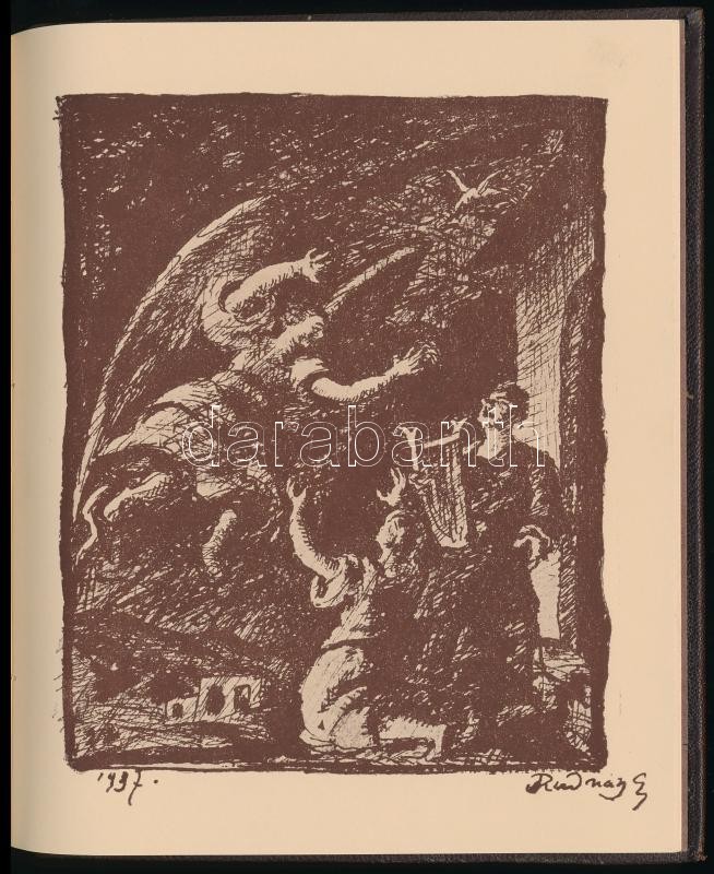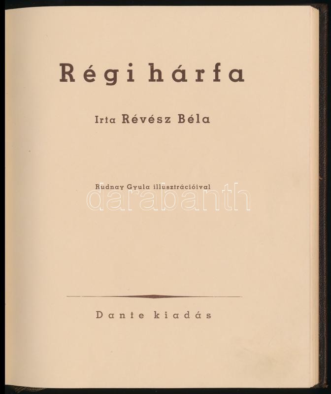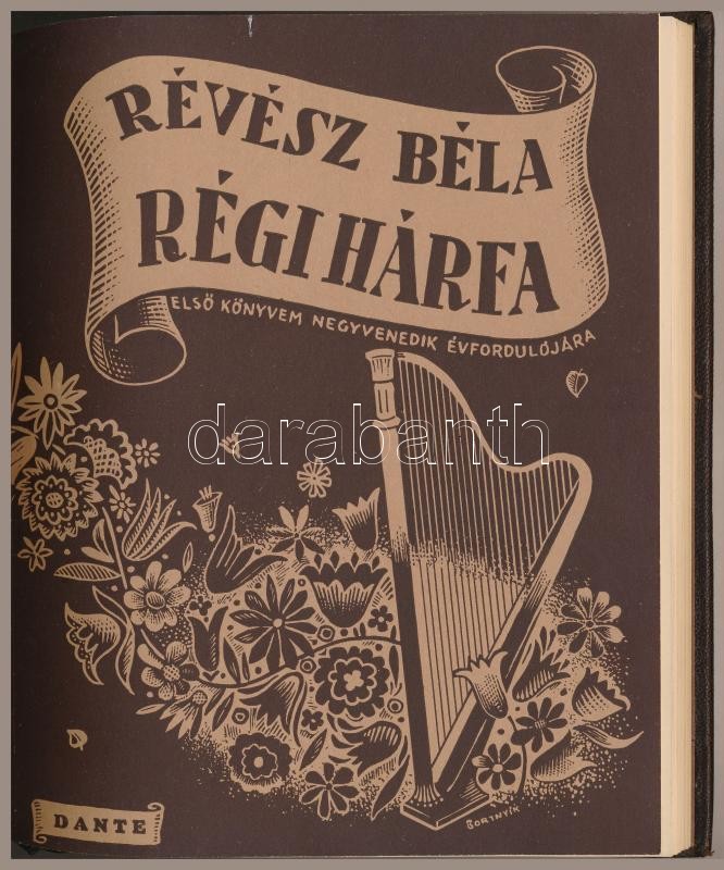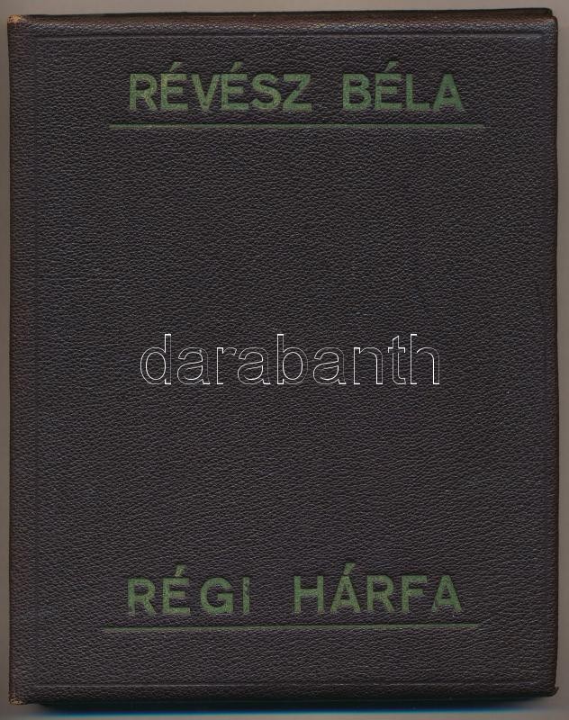 Révész Béla: Régi hárfa. Rudnay Gyula illusztrációival. Bp.,(1938), Dante,(Általános-ny.), 34 sztl. lev.+ 6 (Rudnay Gyula illusztrációi.) t. A papírborító rajza és a kötet terve Bortnyik Sándor munkája. Kiadói egészbőr-kötés, benne Bortnyik Sándor által illusztrált kiadói papírborítókkal, jó állapotban. A szerző, Révész Béla (1876-1944) által dedikált példány: "10. számú példány. A Magyarországi Vas- 's Fémmunkások Központi Szövteségének Központi Könyvtárának elvtársi üdvözlettel: Révész Béla. Budapest 1938 II. 7."