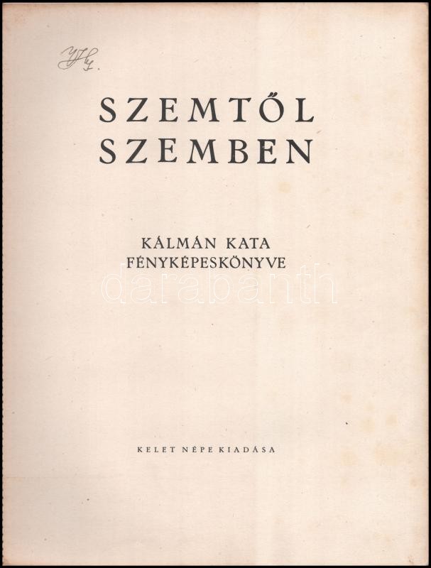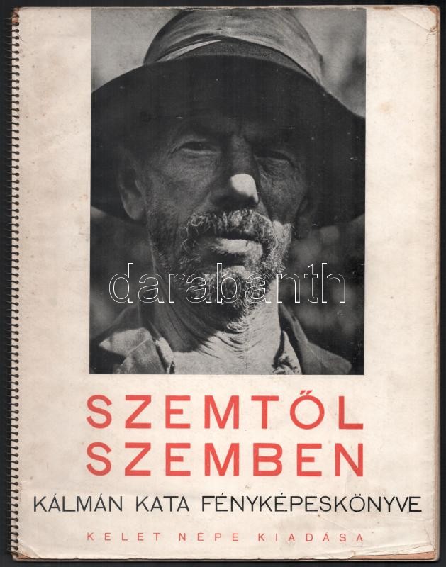 Kálmán Kata: Szemtől szemben. - - fényképeskönyve. Bp.,(1940.) Kelet Népe,(Pápai Ernő-ny.), 4 p.+32 (fekete-fehér képtáblák) t. +4 p. Kiadói illusztrált spirálkötésben, kissé foltos, kissé szakadt borítóval.