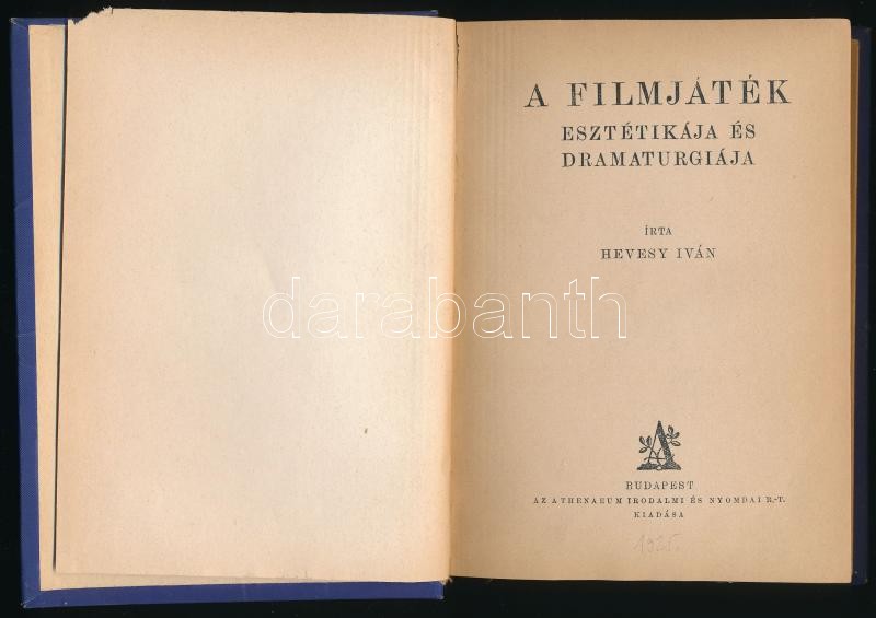 Hevesy Iván: A filmjáték esztétikája és dramaturgiája. Élet és tudomány. Bp.,(1925.),Athenaeum, 217+3 p. Első kiadás. Kiadói aranyozott egészvászon sorozatkötés. Kissé kopott gerinccel, de egyébként jó állapotban.