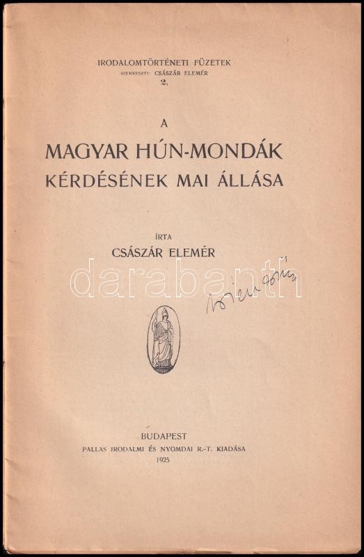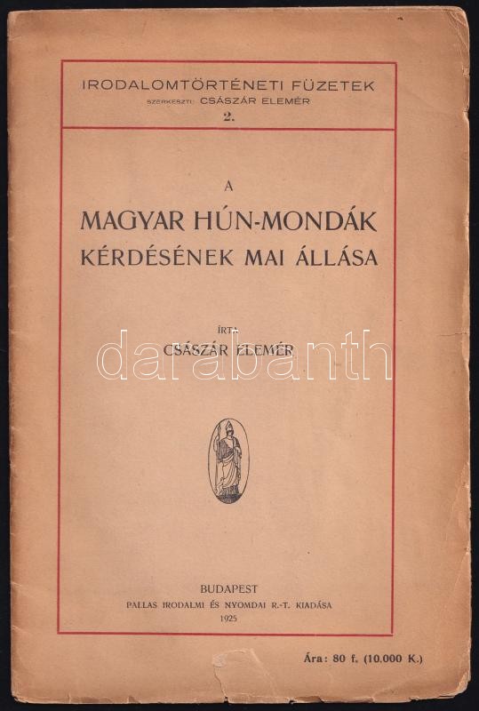 Császár Elemér: A magyar hún-mondák kérdésének mai állása. Irodalomtörténeti Füzetek 2. Bp., 1925., Pallas, 29 p. Kiadói papírkötés, a borítón kis szakadásokkal.