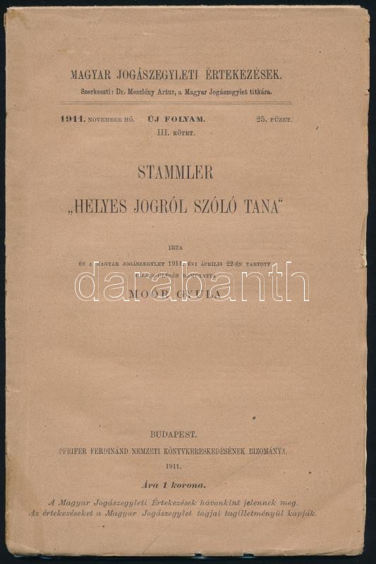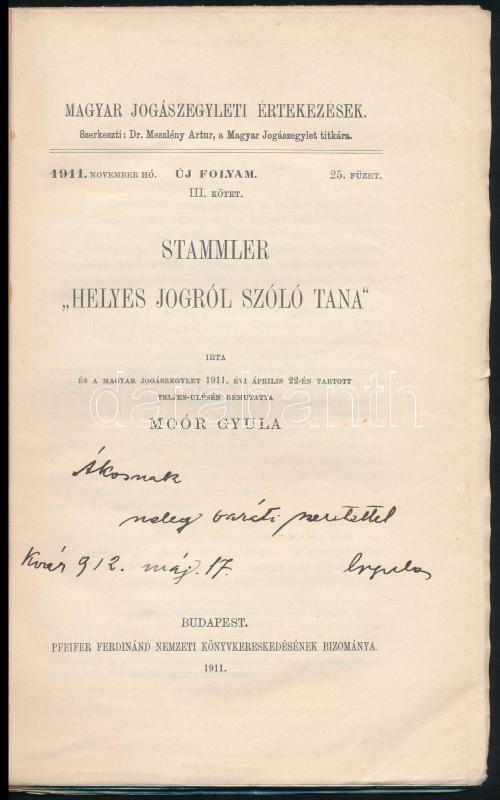 Moór Gyula: Stammler "helyes jogról szóló tana." Írta és a Magyar Jogászegylet 1911. évi április 22-én tartott teljes-ülésen bemutatta: - -. Magyar Jogászegyleti Értékezések. Új folyam. III. köt. 25. füzet. Bp., 1911, Pfeifer Ferdinánd, (Franklin-ny.), 2+209-293 p. Kiadói papírkötés. A szerző, Moór Gyula által dedikált példány. Moór Gyula (1888-1950) jogtudós, később egyetemi tanszékvezető tanár, Budapesti Tudományegyetem rektora, majd országgyűlési képviselő, és az MTA ideiglenes elnöke(1945-1946.)