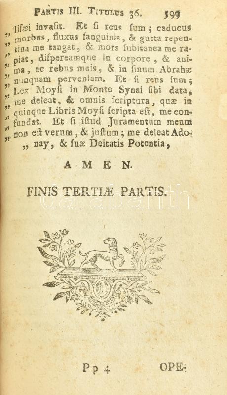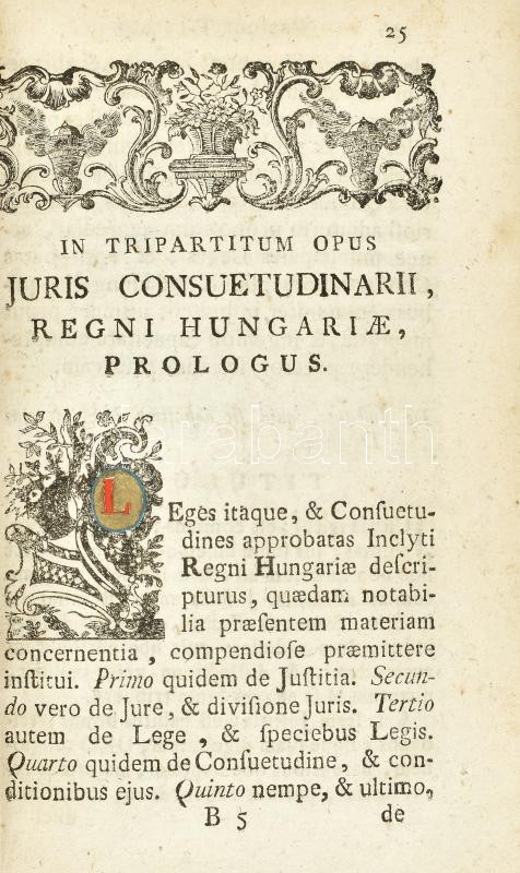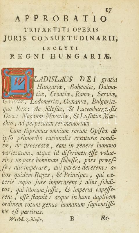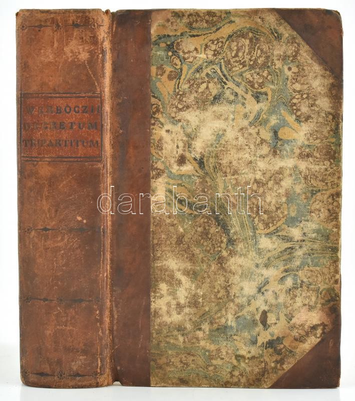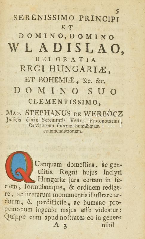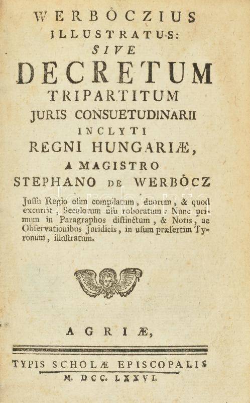 [Werbőczy István (1465-1541)] Werbőczius illustratus: sive Decretum Tripartitum juris consuetudinarii inclyti regni Hungariae. A magistrato Staphano de Werbőcz. Agriae, 1776, Typis Scholae Episcopalis, 615+1 p.+ 8 sztl. lev. Latin nyelven. Fametszetű könyvdíszekkel. Két helyen kézzel festett és egy helyen részben kézzel festett későbbi (modern) kezdőbetűkkel/iniciálékkal. Ritkább egri kiadás! Korabeli kopott félbőr-kötésben, néhány lapon bejelöléssel, az elülső és hátsó szennylapokon possessori bejegyzésekkel, ex libris-szel ('modern'.)