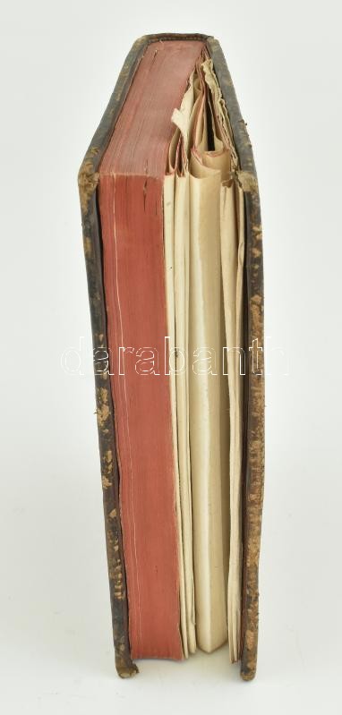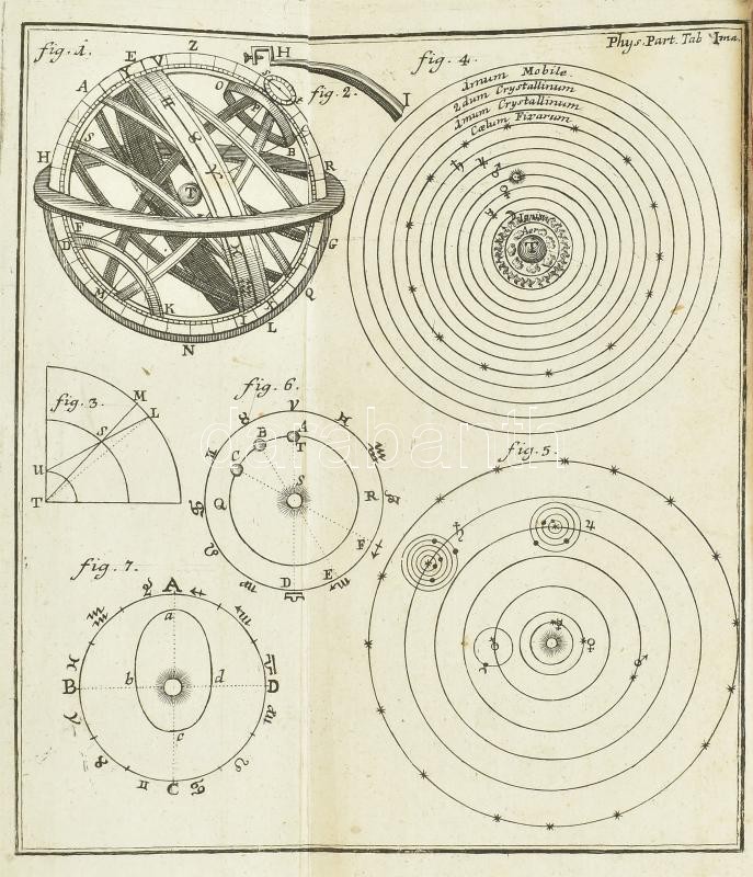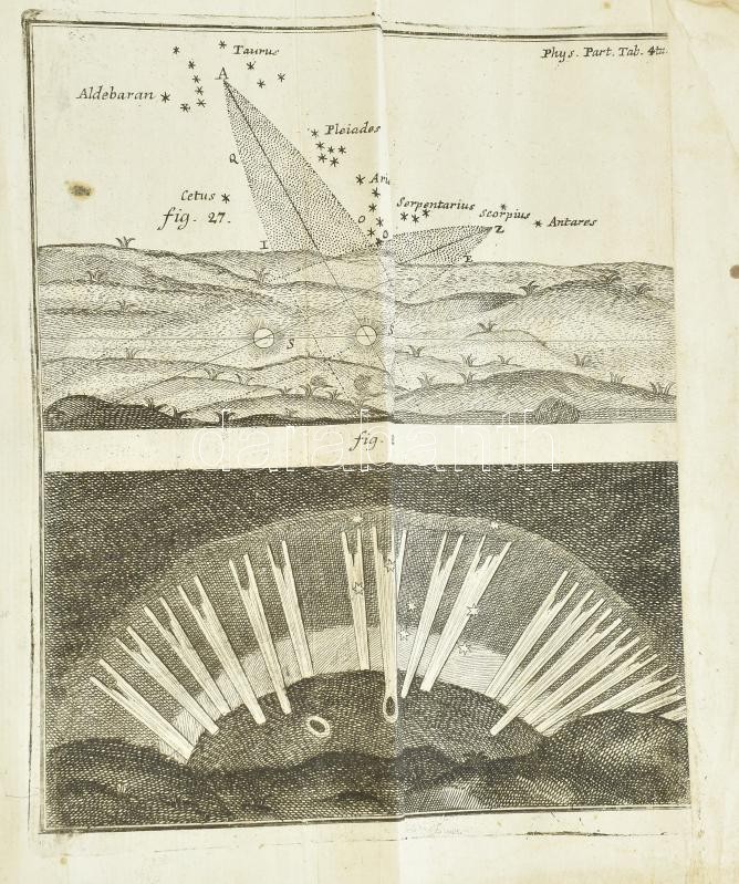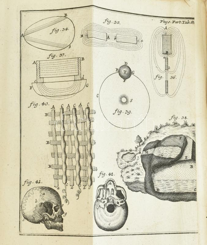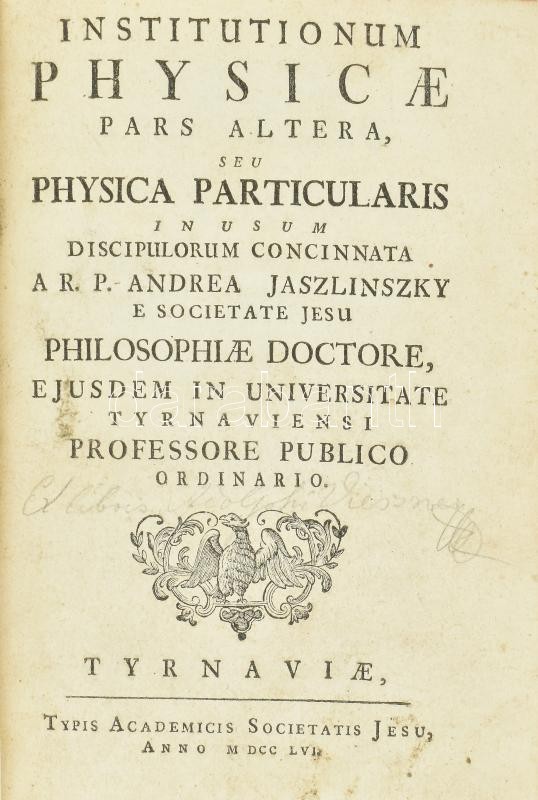 [Jaszlinszky András (1715-1783)] Andreas Jaszlinszky: Institutionum Physicae Pars Altera, seu physica particularis ... Tyrnaviae [Nagyszombat], 1756, Typis Academicis Societetis Jesu, 341+1+8 p. + 8 (kihajtható rézmetszetű képtáblák) t. Latin nyelven. Korabeli aranyozott gerincű egészbőr-kötésben, a gerincen piros címkével, festett lapélekkel, kopott borítóval, a táblák gyűröttek, rongyosak, közte javítottak is, és kissé sérült is, de meg vannak (!), ex libris névbejegyzéssel, a szennylapokon kis lyukakkal és a kötéstáblák belsején szúrágta lyukkal. Ritka!