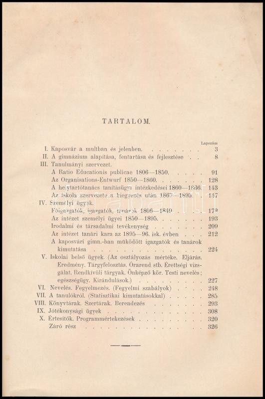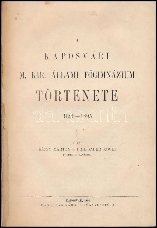 Bécsy Márton-Prilisauer Adolf: A Kaposvári M. Kir. Állami Főgimnázium Története. 1806-1895. Kaposvár, 1896, Hagelman Károly, 328+1 p. Átkötött félvászon-kötésben, kopott, kissé foltos borítóval.