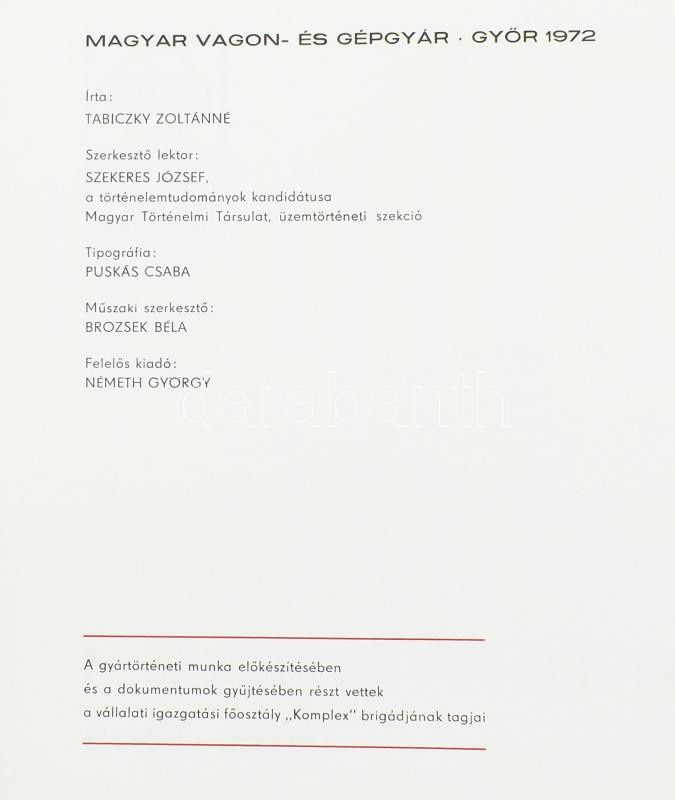 Tabiczky Zoltánné: A Magyar Waggon és Gépgyár Története 1-2. köt. 1. köt.: 1896-1945. 2. köt.: 1946-1972. Győr, 1972-1977., Magyar Vagon és Gépgyár. Gazdag képanyaggal illusztrált. Kiadói egészvászon-kötés, kiadói papír védőborítóban, szép állapotban.