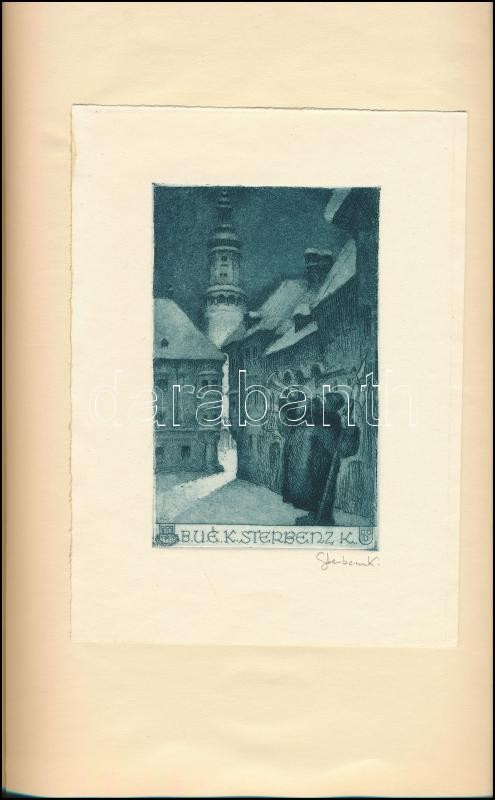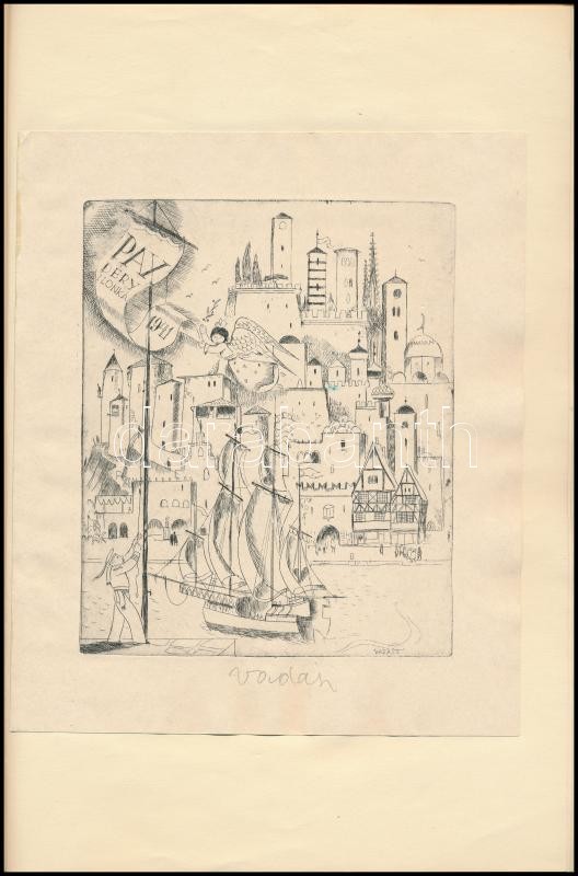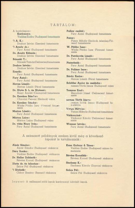 1941 Békés Újévet! 1941. A Magyar Exlibrisgyűjtők és Grafikabarátok Egyesület kiadványai (MEGE) XIII. A könyv művészi összeállítását Fery Antal végezte. Bp.,1941., 2 sztl. lev. + 25 (fametszetű ex-libris) + 8 (rézmetszetű ex libris) + 1 (színes fametszetű ex libris) t. Az ex librisek közül 12+7 aláírt. A címlapon Vadász Endre metszete. Kiadói fűzött papírkötés, ex libris-szel. Megjelent 250 példányban, számozott (6./30) példány.