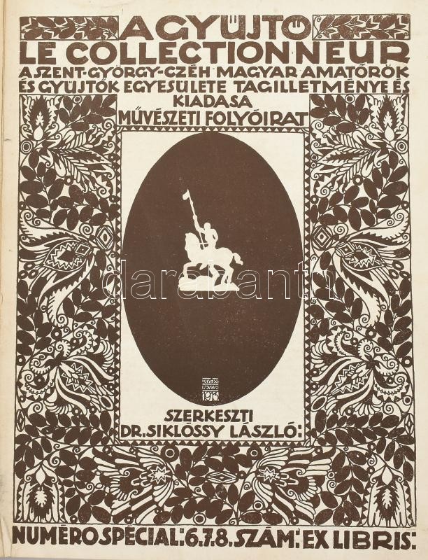 "A gyűjtő" Ex Libris különszáma. Az ex-libris Magyarországon és külföldön. Le Collectionneur Numéro Special. 6.7.8. Szerk.: Siklóssy László. Bp., [1913], Szent-György Czéh Magyar Amatőrök és Gyűjtők Egyesülete, Hornyánszky Viktor-ny., 158 (149-306)+2 p.+ 4 t.(színes)+ XXVI t. melléklet (színes)+8 p. Magyar és francia nyelven. Egyetlen kiadás. Számozatlan példány. Számos egészoldalas, és szövegközti fekete-fehér és színes illusztrációval. Átkötött félvászon-kötésben, egészen kis kopásnyomokkal, az eredeti papírborítókat bekötötték.