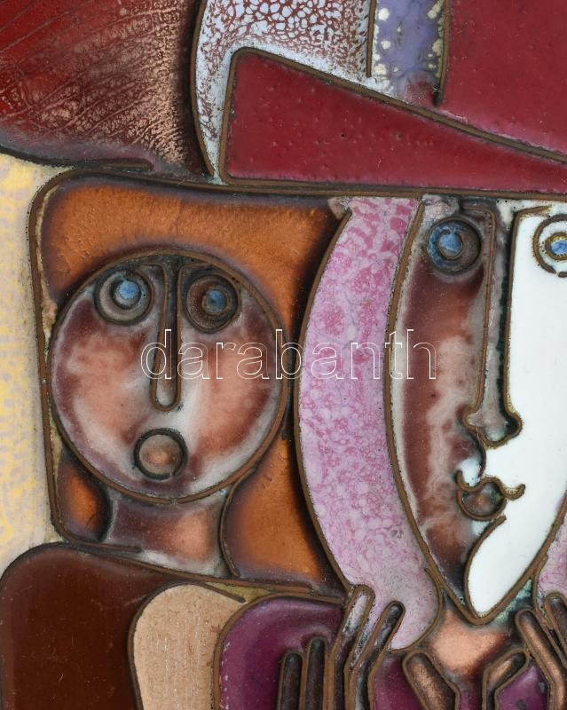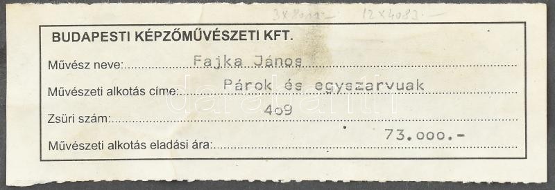 Fajka János (1935): Párok és egyszarvúak, tűzzománc, hibátlan állapotban, igényes keretben 40×24 cm. 1935-ben született Nagykőrösön. Mesterei id. Rácz József, Dudás Jenő, Schubert Ernő és Rákosi Zoltán. Az Iparművészeti Főiskolát 1962-ben végezte el. Tűzzománccal 1970 óta foglalkozik. Munkáival szerepelt nemzetközi kiállításokon:Moszkva, Varsó,Nemzetközi Zománc Biennálé, Limoges stb. "Mivel az alkotás folyamatában a teremtő szellemé a prioritás, előbb azt vizsgáljuk, bőgj' a tartalmi-világnézeti princípium miként van jelen Fajka János művészetében. Nos, eddig megtett útja kétségbevonhatatlanná teszi a figurális ábrázolás iránti elkötelezettségét, hitét. Emberközpontú témáinak férfi-és nőalakjaihoz gyakran társít állatokat, pontosabban lovakat is. Ezek mitikus jelentései ősi erők atavisztikus felhangjaiban gyökereznek. Képeinek szereplői találóan általánosított embertípusok, a rájuk jellemző tulajdonságokkal." Ecsery Elemér