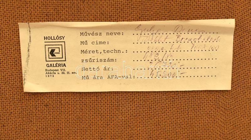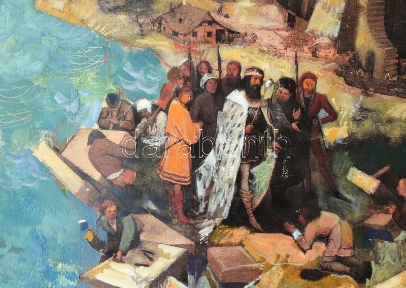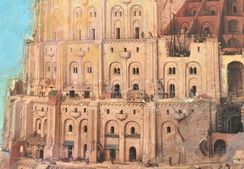 Gulyás Dénes (1927-2003): Tisztelet Brueghelnek, 1984. Olaj, kollázs, farost, jelzett. Hátoldalán Hollósy Galéria címkéjén feliratozott. Alumínium keretben. Bal felső és jobb alsó sarkában kisebb felületi sérülésekkel. 100×100 cm