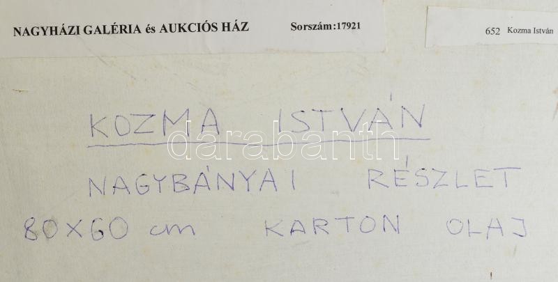 Kozma István (1937- ): Nagybányai részlet. Olaj, karton, jelzett, 80×60 cm. Proveniencia: Nagyházi, 148. árverés, 652. tétel. Üvegezett fa keretben / István Kozma (1937- ): Baia Mare. Oil on cardboard, signed, framed with glass. Provenance: Nagyházi Gallery, 148th auction, lot 652. 80×60 cm