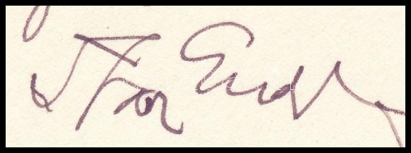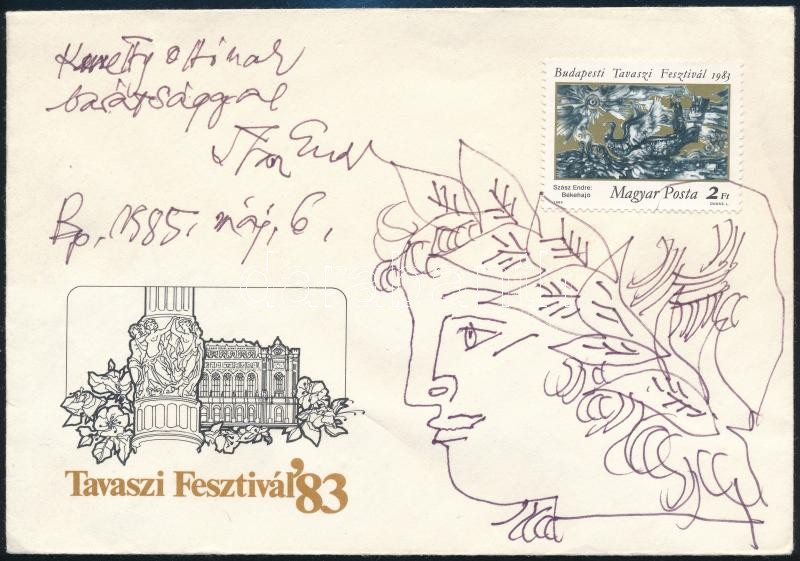 Szász Endre (1927-2003) saját kezű tollrajza és dedikációja a Budapesti Tavaszi Fesztivál '83 borítékján az általa tervezett bélyeggel. Toll, papír. Kmety Ottó filatélia szakértőnek dedikált és dátumozott! 12x17 cm.