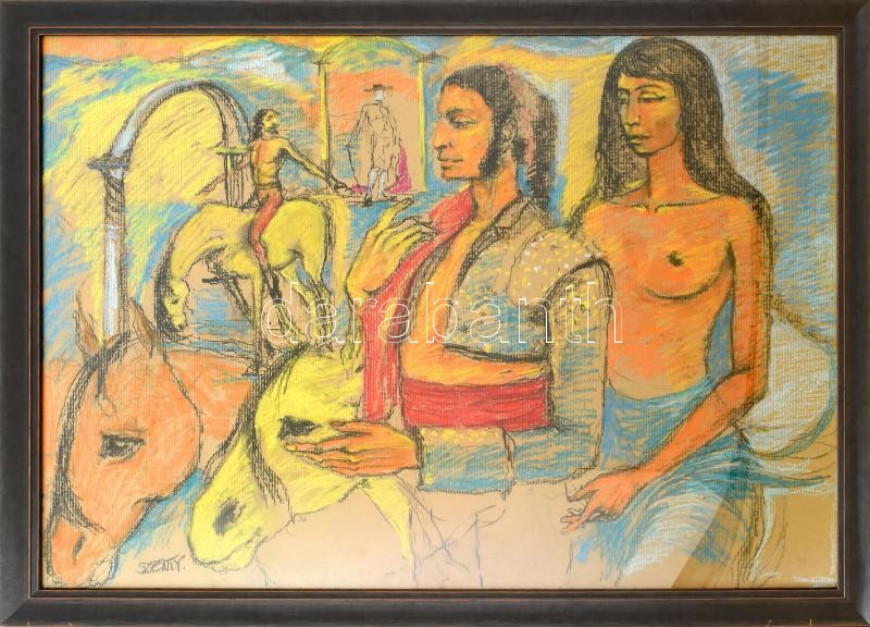 Szentandrássy István (1957-2020): Torreádor és a szép hölgy. Pasztell, karton, jelzett. Üvegezett fa keretben. 70×100 cm. / István Szentandrássy (1957-2020): Toreador and the beauty. Pastell on card board, signed. Framed with glass, 70x100 cm.