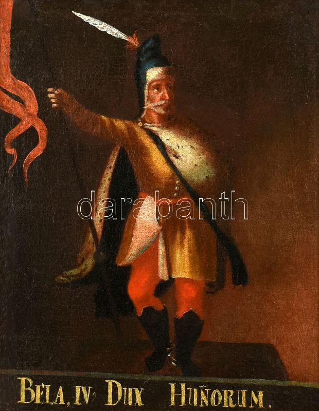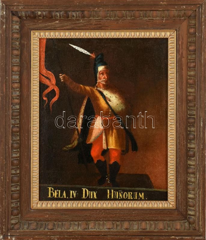 XVIII. v. XIX. sz. ismeretlen magyar festő: IV. Béla király portréja (Béla IV. dux hunorum). Olaj, vászon. Jelzés nélkül. Restaurált, dublírozott. Dekoratív fa keretben. 43x34 cm