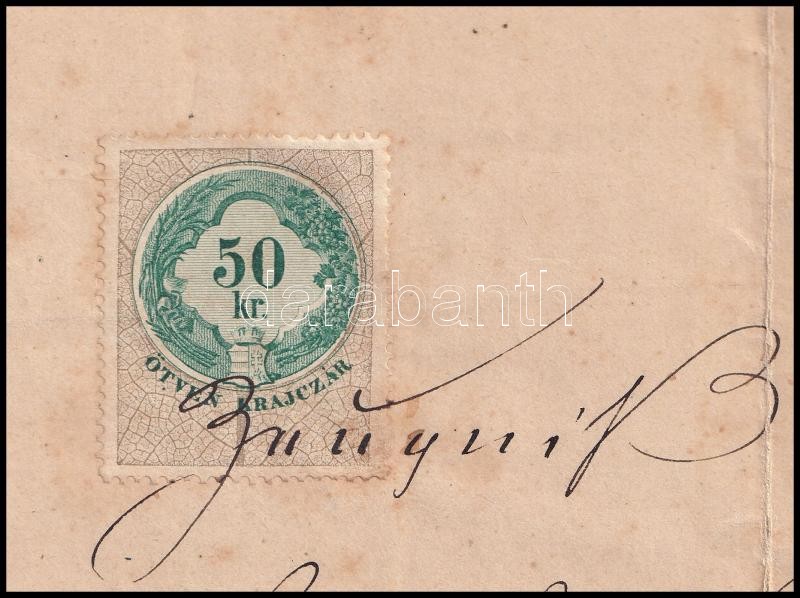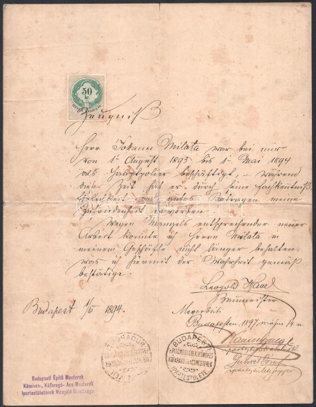 1894 Havel Lipót (1847-1933) építőmester, több neves budapesti épület kivitelezőjének aláírása (Igazságügyi Palota, Vígszínház) munkáltatói igazoláson, 50 kr. okmánbélyeggel, "Budapesti Építő Mesterek Kőmíves-, Kőfaragó-, Ácsmesterek, Ipartestületének" bélyegzéseivel, hajtott, foltos