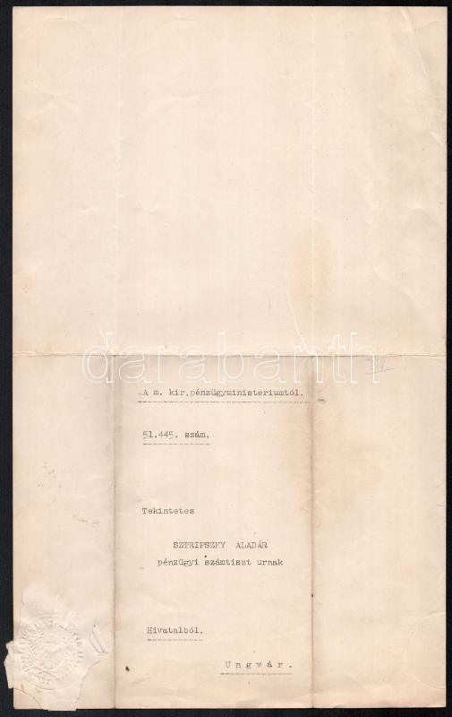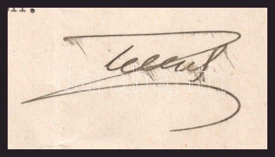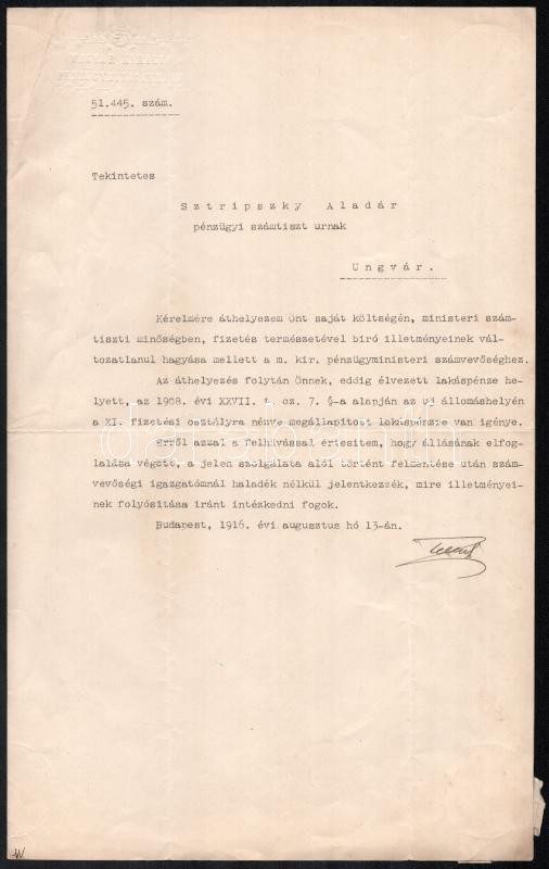 1916 Teleszky János (1868-1939) pénzügyminiszter (második Tisza István-kormány, 1913. június 10. -1917. június 15.) aláírása egy áthelyezésen, ungvári pénzügyi számtiszt részére, 1916. aug. 13., hajtott.