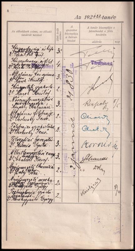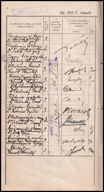 1921 Bp., M. kir. egyetemi közgazdaságtudományi kar fényképes leckekönyve, számos bejegyzéssel, aláírásokkal (köztük gróf Teleki Pál, Cholnoky Jenő, Kornis Gyula, Czettler Jenő, Fellner Frigyes), pecséttel, okmánybélyegekkel, Strammer Ervin hallgató, későbbi budapesti ítélőtáblai bíró részére