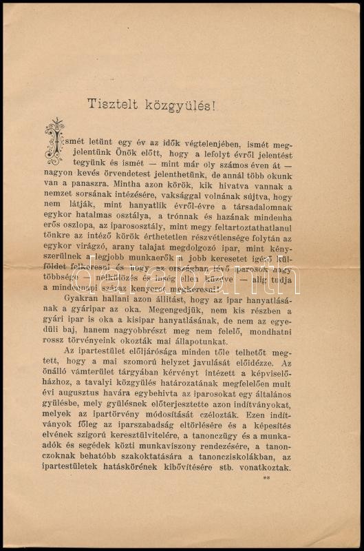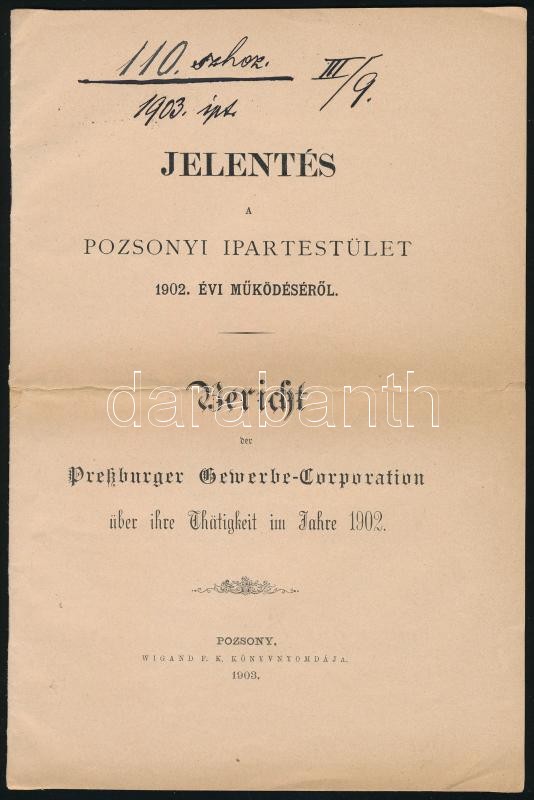 1903 Jelentés a Pozsonyi Ipartestület 1902. évi működéséről. Bericht der Pressburger Gewerbe-Corporation über ihre Thätigkeit im Jahre 1902. Pozsony, Wigand F. K. könyvnyomdája, 15 p. + 1 t. (A pozsonyi ipartestület vagyon mérlege 1902. évre, kihajtható táblázat). Magyar és német nyelven, tűzött papírkötésben, jó állapotban.