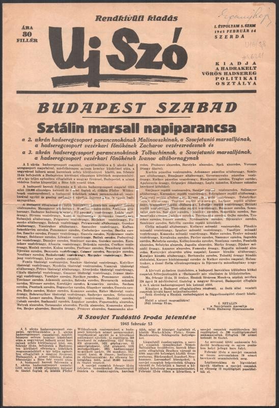 1945. 02. 14. Az Uj Szó c. szovjet újság . 5. szám, Budapest felszabad... https://www.darabanth.com/de/36-Gross-Auktion/36.1/Kunst-Dokumente-andere-Sammelgebiete/Drucksachen~15522/1945-02-14-Az-Uj-Szo-c-szovjet-ujsag-5-szam-Budapest-felszabaditasanak-hirevel~II2487879