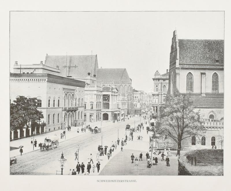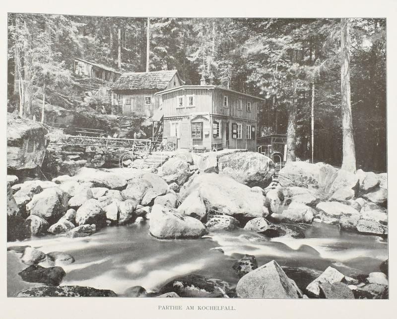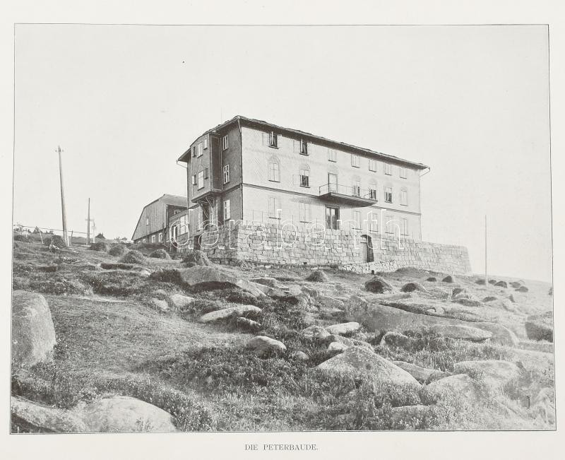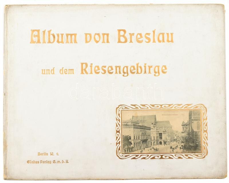 cca 1910-1920 Album von Breslau und dem Riesengebirge. 31 Ansichten nach Momentaufnahmen in Photographiedruck. Berlin, Globus Verlag, 32 p. / Breslau (Wrocław, Boroszló) és az Óriás-hegység (Krkonoše, Karkonosze), album 31 fekete-fehér fotóval, díszes, aranyozott, dombornyomott kartonált papírkötésben, kissé sérült, kopott borítóval, könyvtári címkével, 34,5x27 cm