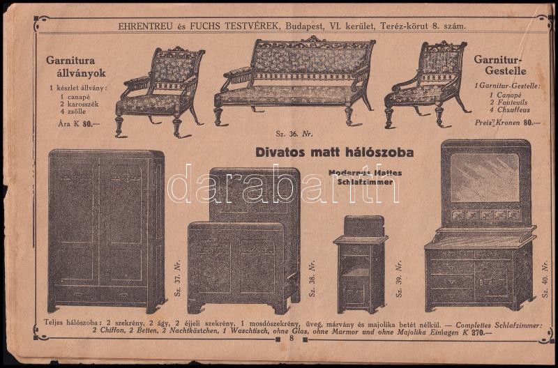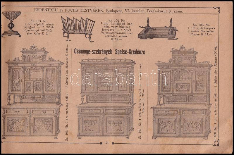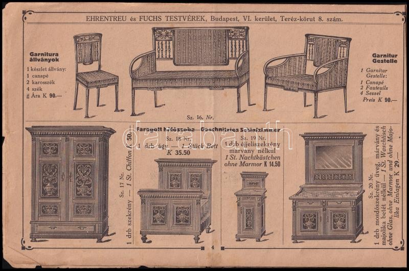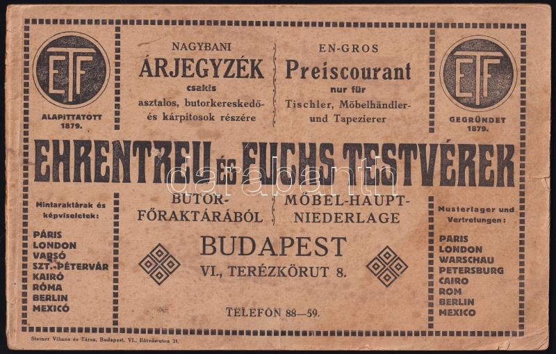 cca 1910 Ehrentreu és Fuchs Testvérek bútornagykereskedése képekkel illusztrált árjegyzéke. Bp., Steiner Vilmos és Társa, 64 p., magyar és német nyelven, foltos, kissé sérült, tűzött papírkötésben