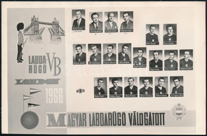1966 Magyar Labdarúgó válogatott csoportképe, Anglia, Labdarúgó VB, rajta a labdarúgók arcképével, Baróti Lajos edző, Illovszky Rudolf, Botár Zoltán, Vinkovics Lajos, Gelei József, Géczi István, Mátrai Sándor, Mészöly Kálmán, Szepesi Gusztáv, Ihász Kálmán, Sárosi László, Nagy István, Sipos Ferenc, Solymosi Ernő, Nagy Antal, Farkas János, Bene Ferenc, Albert Flórián, Rákosi Gyula, Fenyvesi Máté, 11x18 cm