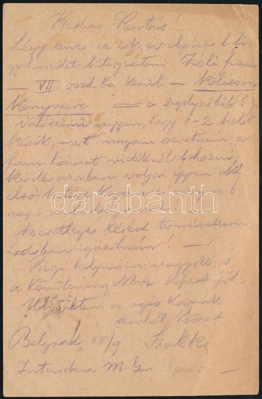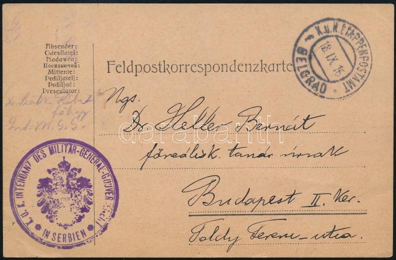Beschreibung: 1916 dr. Heller Bernátnak néprajztudós, Rabbiképző igazgatója által írt tábori posta levelezőlap Belgrádból.