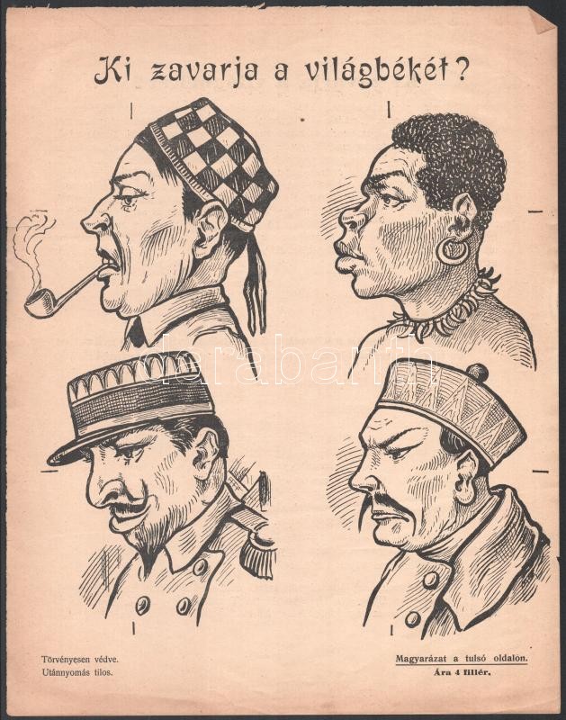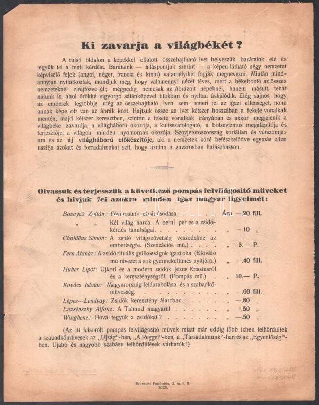 cca 1935 "Ki zavarja a világbékét?" antiszemita propaganda nyomtatvány gúnyrajzokkal a bécsi Pumbedita nyomdából; kis beszakadással / Hungarian antisemitic leaflet printed in Vienna; folded, torn condition. 29×23 cm