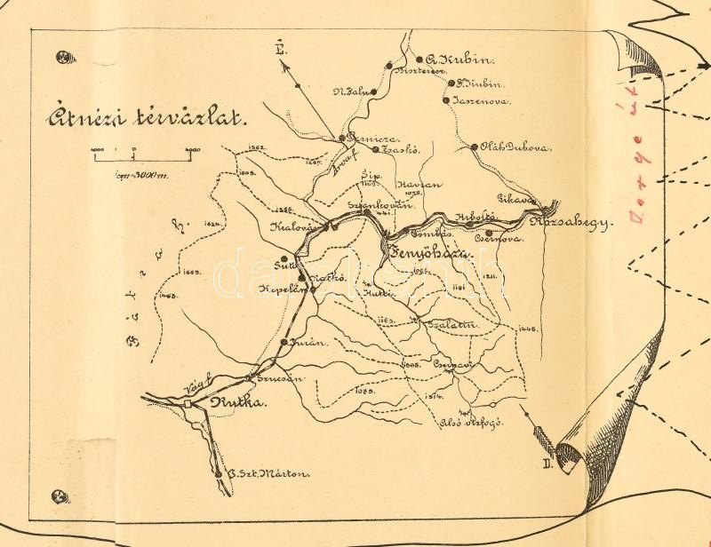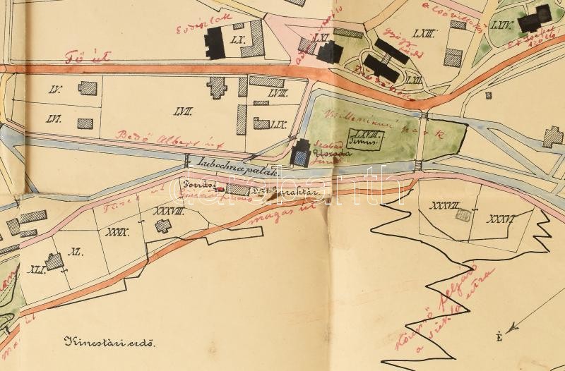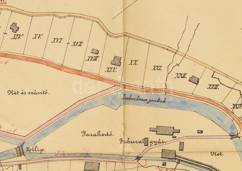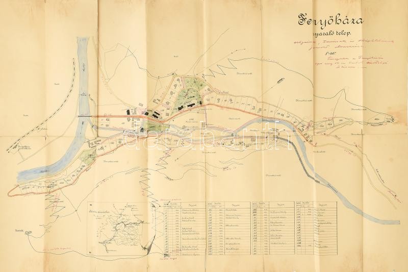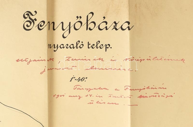 1901 Fenyőháza/Lubochna nyaralótelep térkép vázlata, rajta a Vág (Váh/Waag) folyóval és Lubochna patakkal, kézzel rajzolt, színezett, hajtott, a hajtásnyomok mentén szakadt, sérült, 59,5x89,5 cm / 1901 Map of Lubochna holliday village, with Váh and Lubochna rivers on, hand draw and hand coloured, folded, damaged, 59,5x89,5 cm