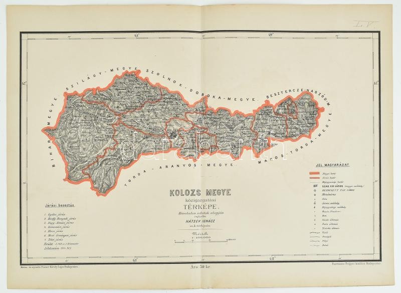 cca 1890-1900 Kolozs megye közigazgatási térképe. Hivatalos adatok alapján rajzolta: Hátsek Ignác m. kir. térképész. 1 : 500.000, metsz. és nyomta: Posner Károly Lajos, Bp., Rautmann Frigyes kiadása. Hajtva, szélén apró sérüléssel, 50,5x37,5 cm