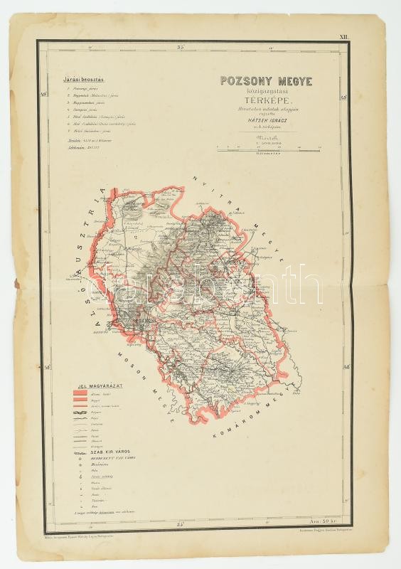 cca 1890-1900 Pozsony megye közigazgatási térképe. Hivatalos adatok alapján rajzolta: Hátsek Ignác m. kir. térképész. 1 : 500.000, metsz. és nyomta: Posner Károly Lajos, Bp., Rautmann Frigyes kiadása. Hajtva, szélein kissé sérült, foltos, 51,5x36,5 cm