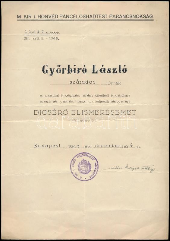 1942 Páncélos hadtest parancsnokság dícsérő elismerés vitéz Major altb... https://www.darabanth.com/de/36-Gross-Auktion/36.1/Kunst-Dokumente-andere-Sammelgebiete/Militaria~15156/1942-Pancelos-hadtest-parancsnoksag-dicsero-elismeres-vitez-Major-altbnagy-alairassal~II2488407