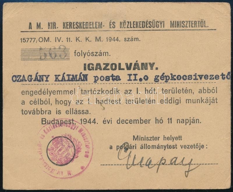 1944. 12. 11. Mozgási engedély a I. hadtest területesre gépkocsivezető... https://www.darabanth.com/de/36-Gross-Auktion/36.1/Kunst-Dokumente-andere-Sammelgebiete/Militaria~15156/1944-12-11-Mozgasi-engedely-a-I-hadtest-teruletesre-gepkocsivezeto-reszere~II2487385