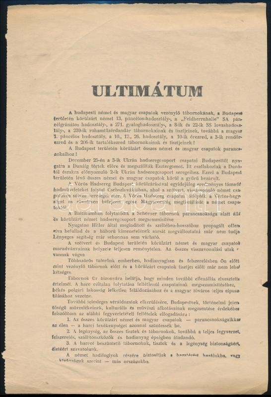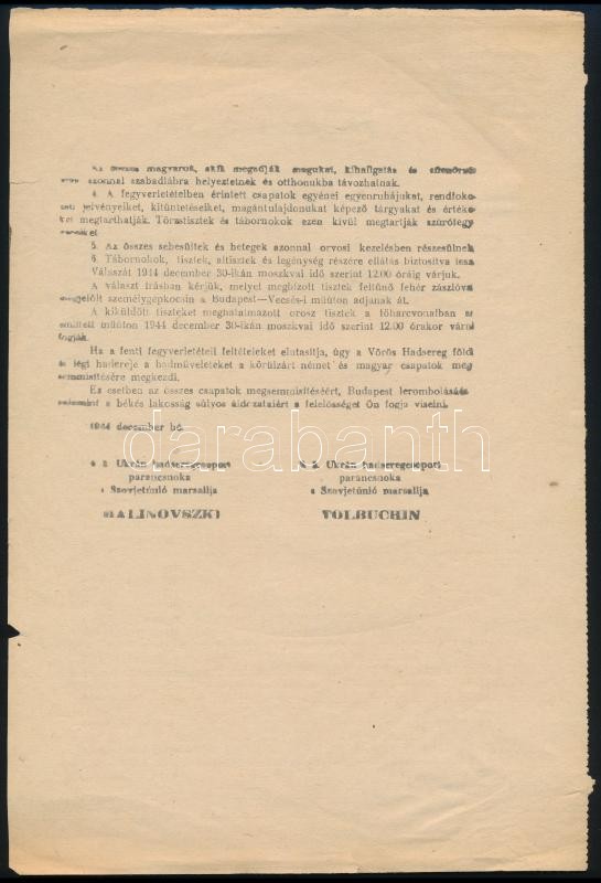 1944. 12. 24-31. Malonovszkij és Tolbuchin szovjet tábornokok ultimátu... https://www.darabanth.com/de/36-Gross-Auktion/36.1/Kunst-Dokumente-andere-Sammelgebiete/Militaria~15156/1944-12-24-31-Malonovszkij-es-Tolbuchin-szovjet-tabornokok-ultimatuma-szorolapon-a-magyar-cs~II2487533