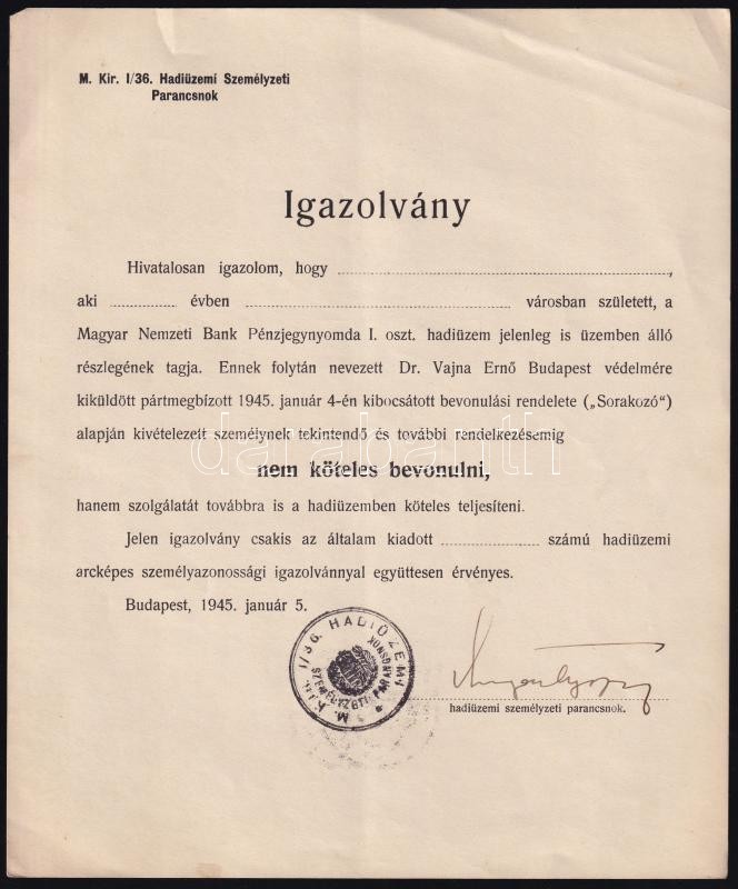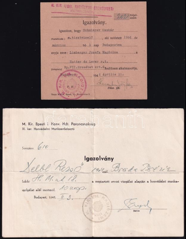 1944-1945 3 db mentesítési igazolvány https://www.darabanth.com/de/36-Gross-Auktion/36.1/Kunst-Dokumente-andere-Sammelgebiete/Militaria~15156/1944-1945-3-db-mentesitesi-igazolvany~II2487392