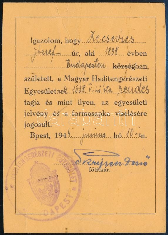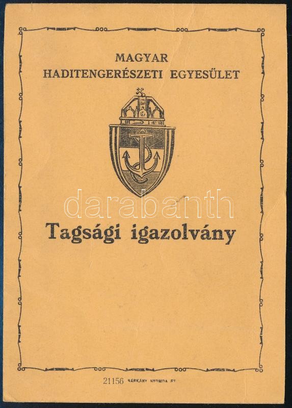 1944 Magyar Haditengerészeti Egyesület tagsági igazolvány / Hungarian ... https://www.darabanth.com/de/36-Gross-Auktion/36.1/Kunst-Dokumente-andere-Sammelgebiete/Militaria~15156/1944-Magyar-Haditengereszeti-Egyesulet-tagsagi-igazolvany-Hungarian-Navy-Assoc-ID~II2488462